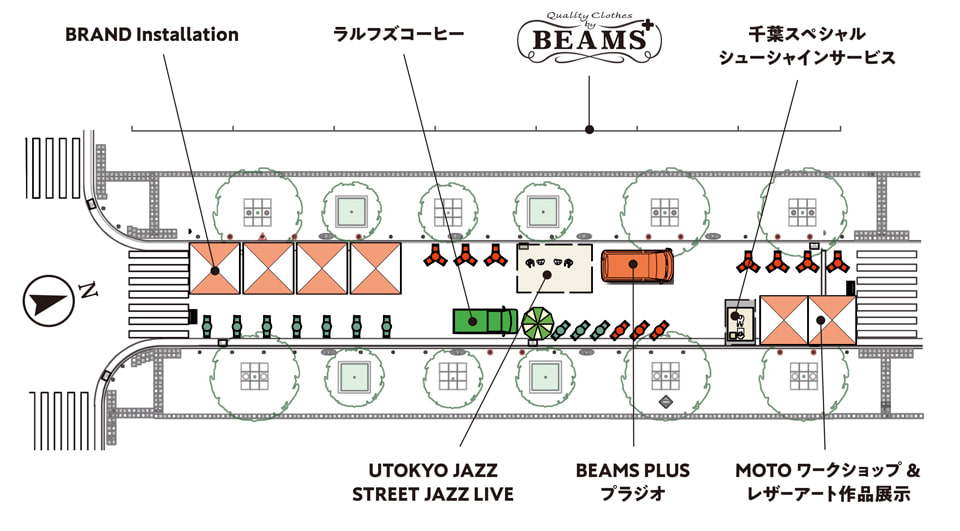オープンを記念して、〈BEAMS PLUS〉とゆかりのある5ブランドの世界観が感じられる展示をはじめ、〈MOTO〉が開催する革小物のワークショップや高品質な技術を誇る「千葉スペシャル」のシューシャインサービス。「UTOKYO JAZZ」によるストリートジャズライブのほか〈ラルフ ローレン〉が展開するコーヒーショップ「ラルフズコーヒー」を期間限定出店。